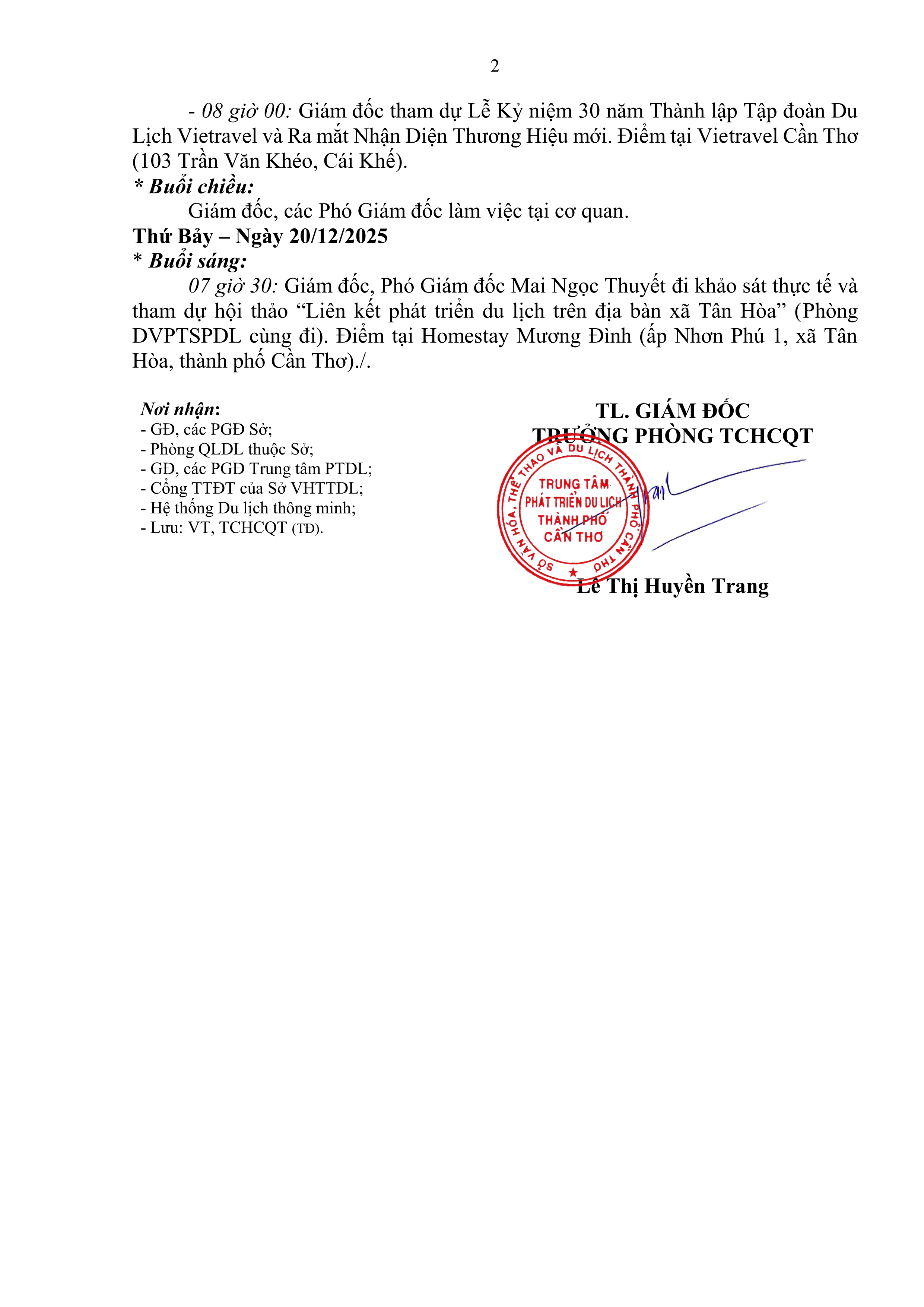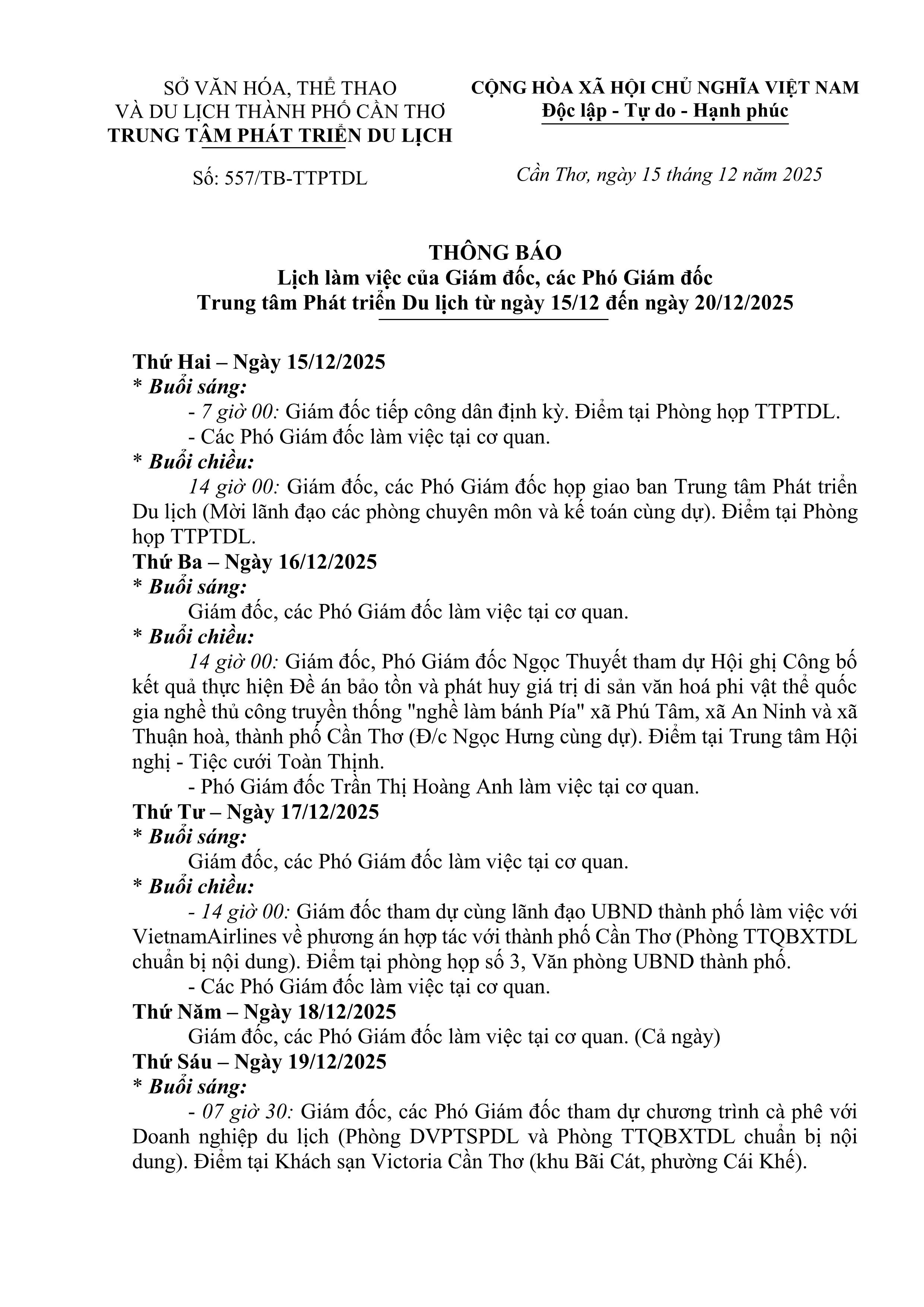 THÔNG BÁO Lịch làm việc của Giám đốc, các Phó Giám đốc Trung tâm Phát triển Du lịch từ ngày 15/12 đến ngày 20/12/2025