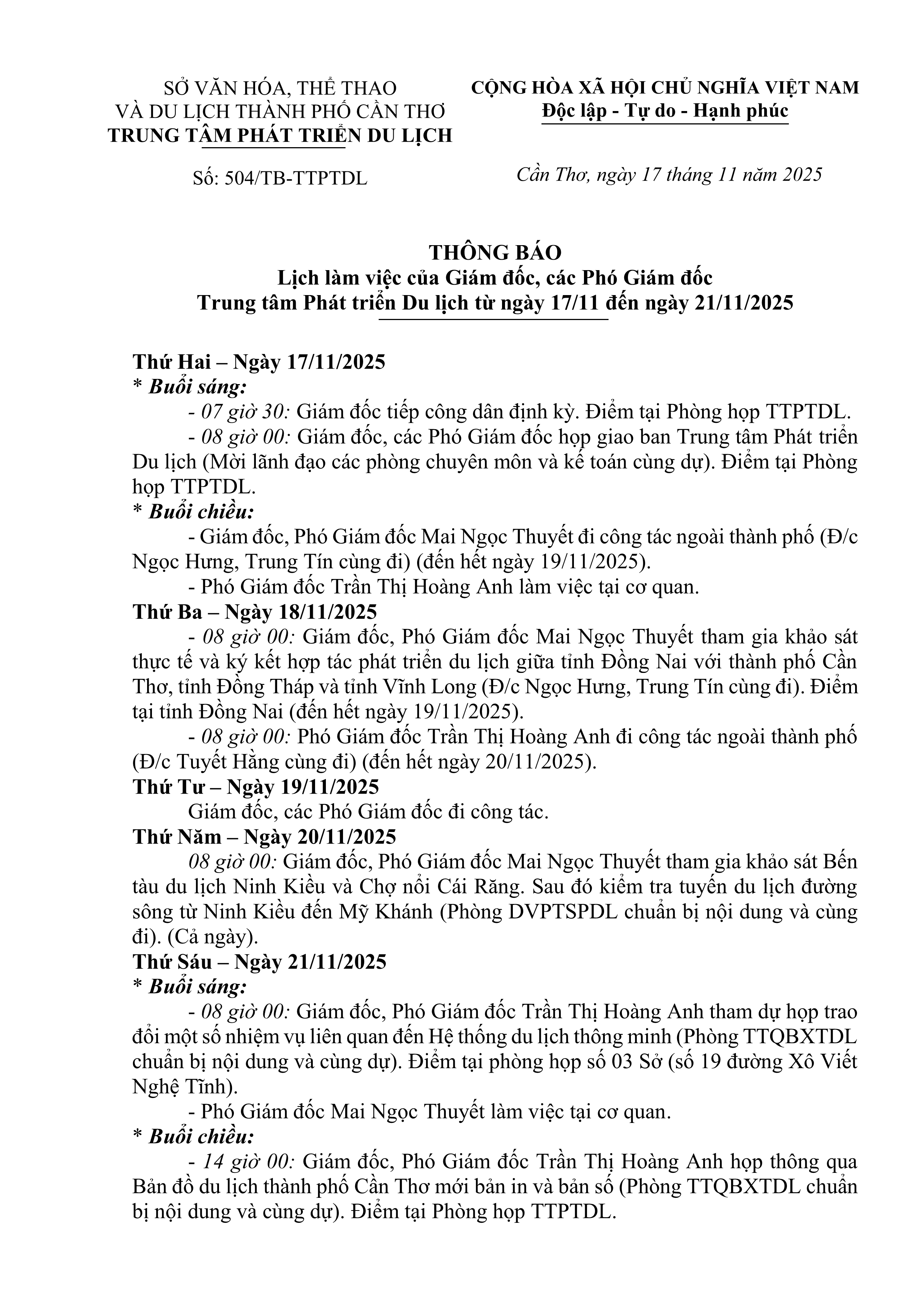 THÔNG BÁO Lịch làm việc của Giám đốc, các Phó Giám đốc Trung tâm Phát triển Du lịch từ ngày 17/11 đến ngày 21/11/2025