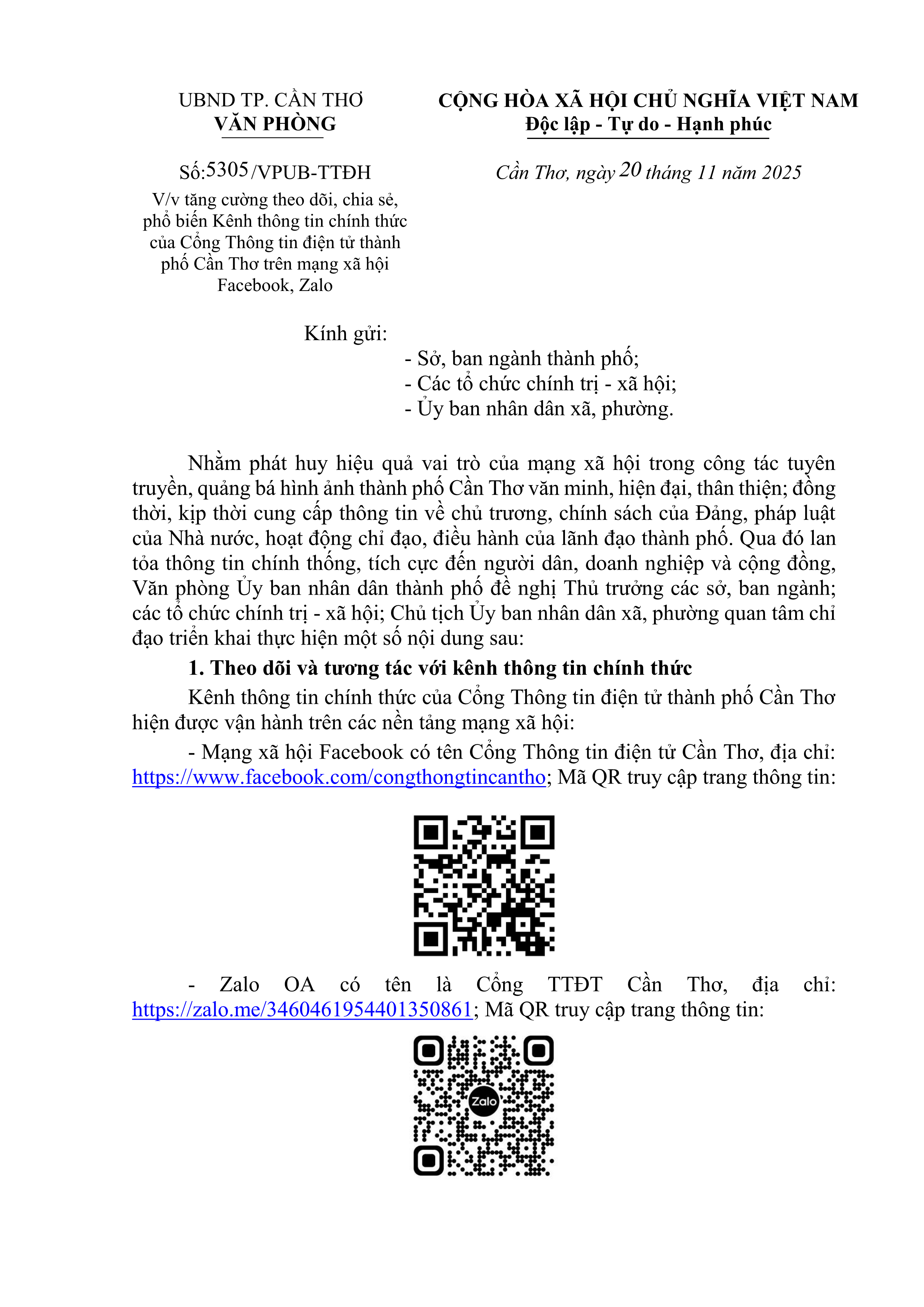 Thông báo Về việc tăng cường theo dõi, chia sẻ, phổ biến Kênh thông tin chính thức của Cổng Thông tin điện tử thành phố Cần Thơ trên mạng xã hội Facebook, Zalo