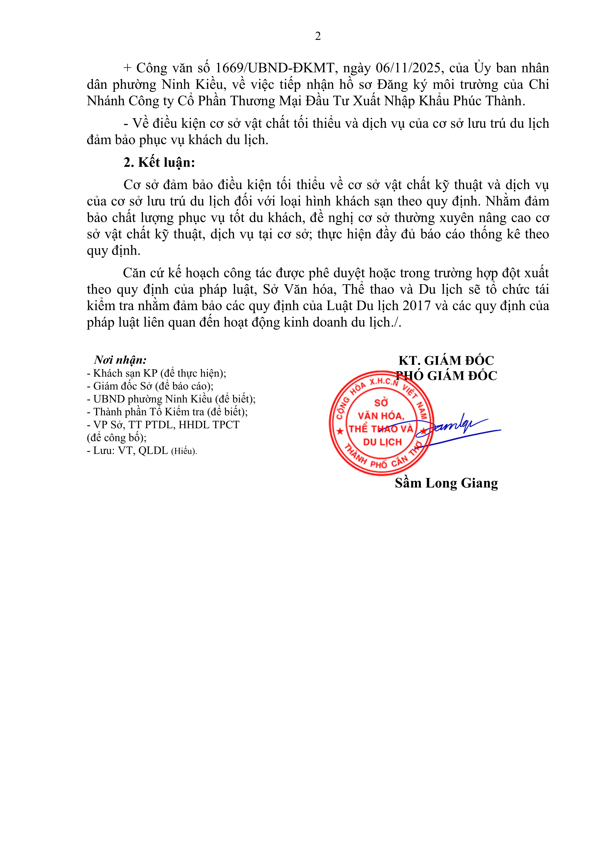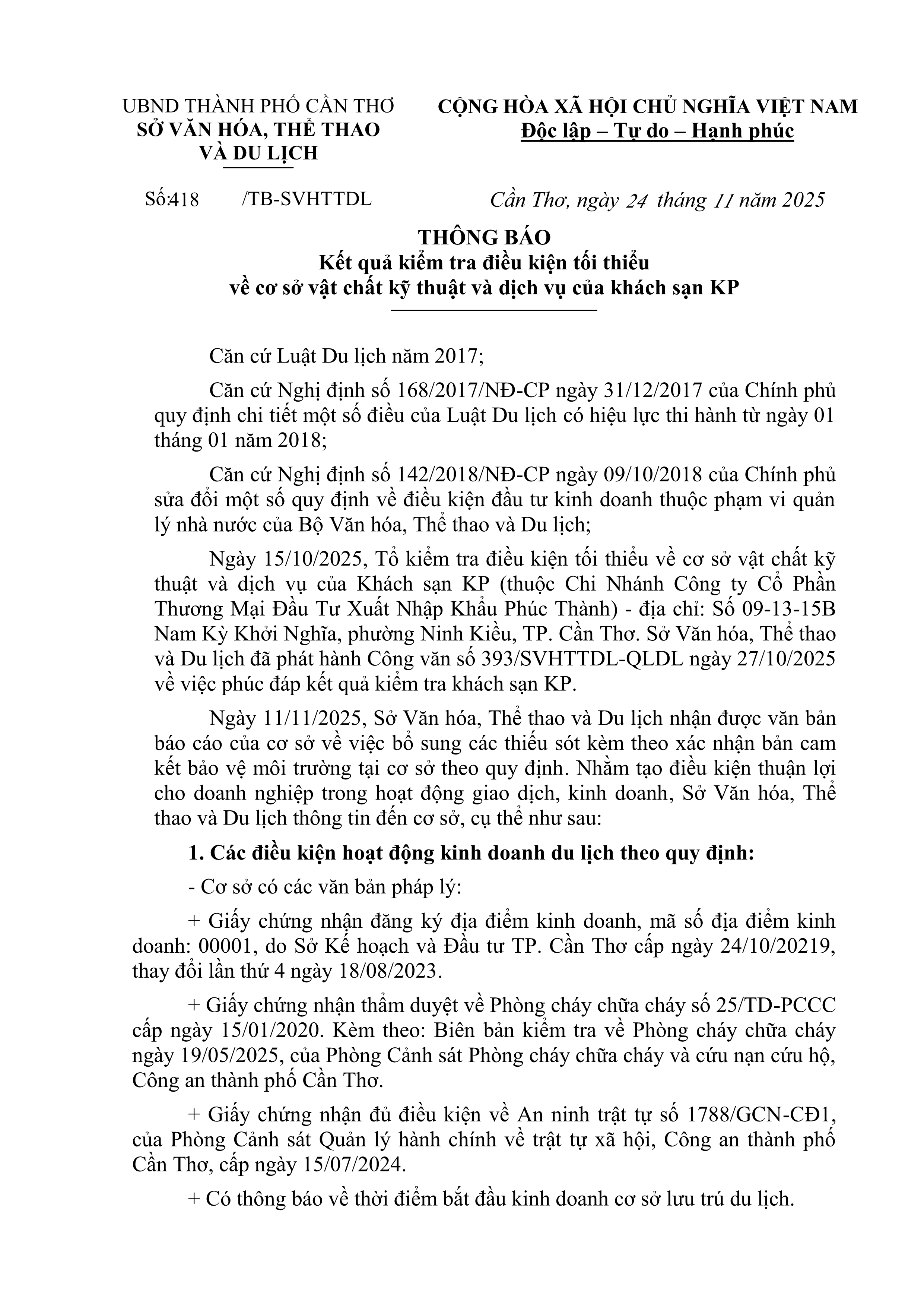 Thông báo Kết quả kiểm tra điều kiện tối thiểu về cơ sở vật chất kỹ thuật và dịch vụ của khách sạn KP