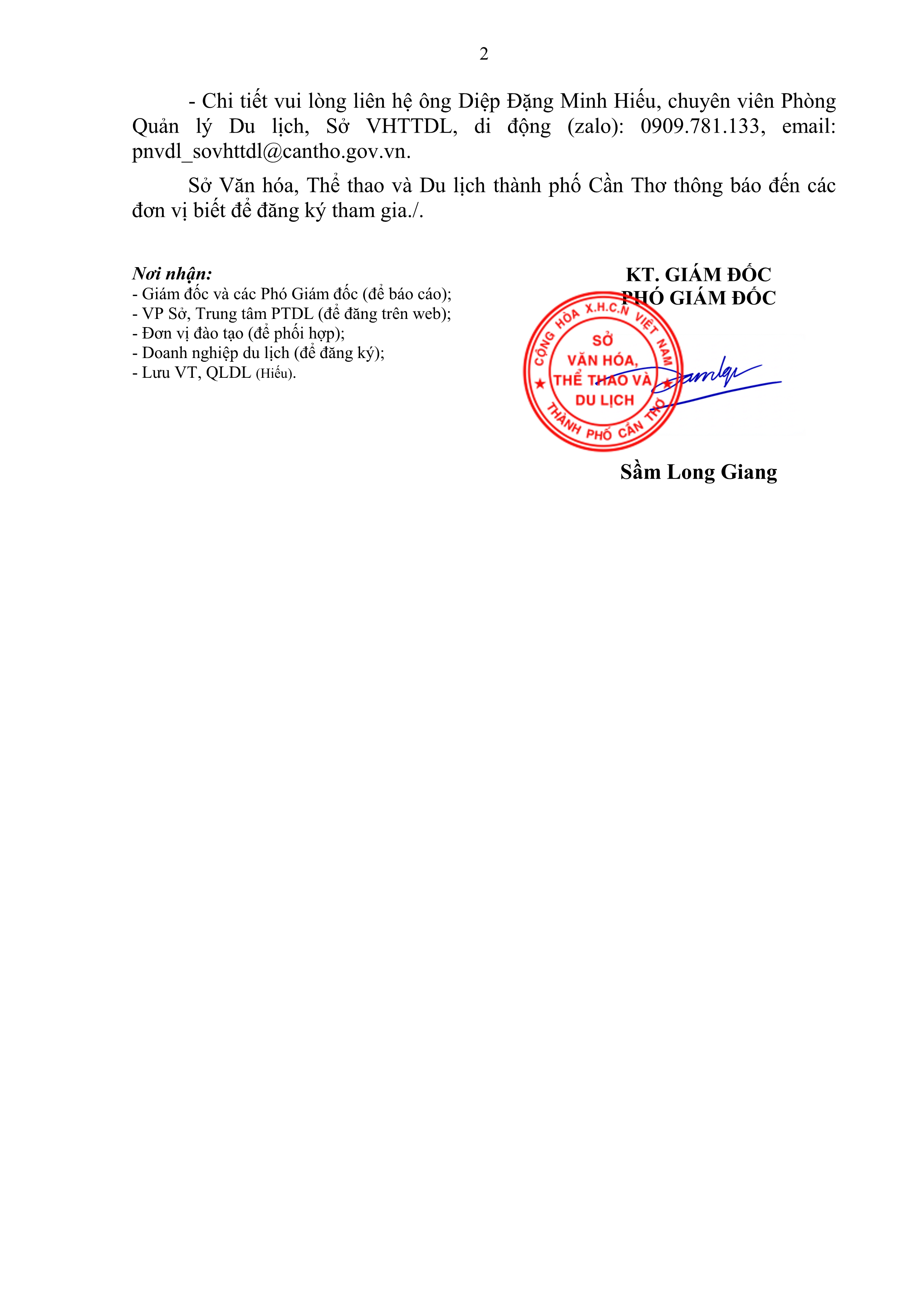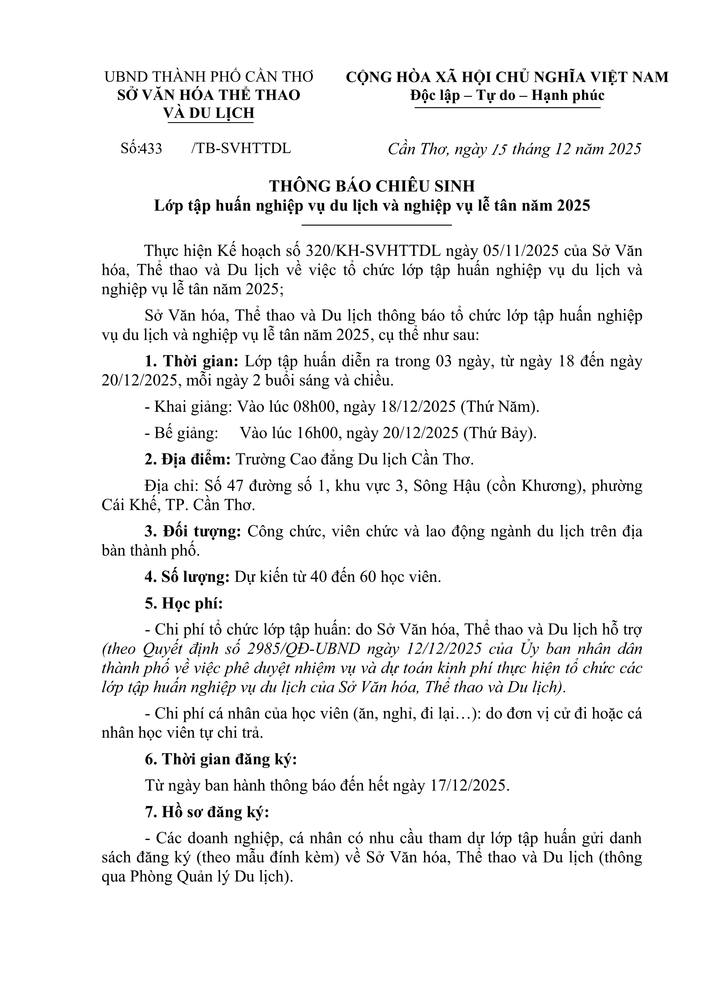 THÔNG BÁO CHIÊU SINH Lớp tập huấn nghiệp vụ du lịch và nghiệp vụ lễ tân năm 2025