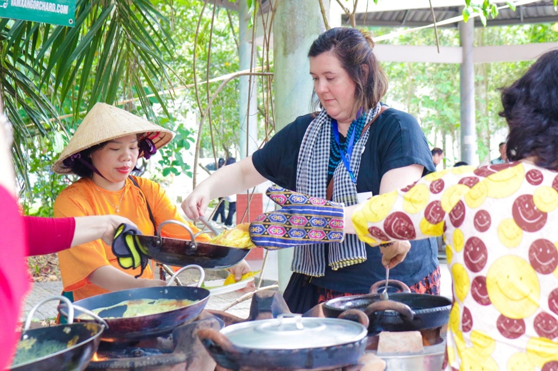 Nếu yêu thích ẩm thực dân gian, du khách có thể tham gia trải nghiệm làm bánh miền Tây như bánh xèo, bánh khọt, bánh lá dừa... Tiếng “xèo” vui tai, mùi nghệ vàng hòa trong khói bếp, cùng câu chuyện thân tình của những người làm vườn khiến không gian thêm ấm áp.